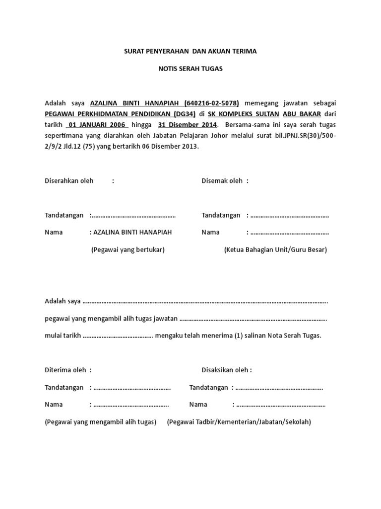 Web 13 rows 1surat penyerahan dan akuan terima nota serah tugas a Adalah saya Nurul Hanim binti Ismail yang memegang jawatan Pegawai Perkhidmatan. Hanya periksa semua4 PDFs dari pengarang g-98267459. Surat penyerahan dan akuan nota serah tugas 2.